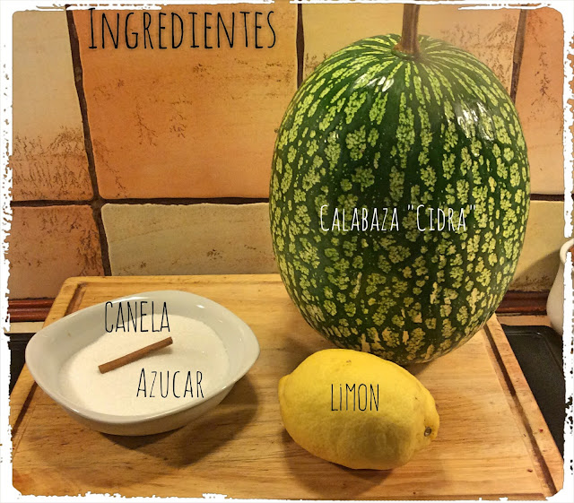 1 CALABAZA "Cidra", a la que habremos quitado la piel y las pepitas - 1 LIMÓN, solamente usaremos aquí su piel finamente pelado - 1 Kilo de AZÚCAR aprox. - 1 rama de CANELA.